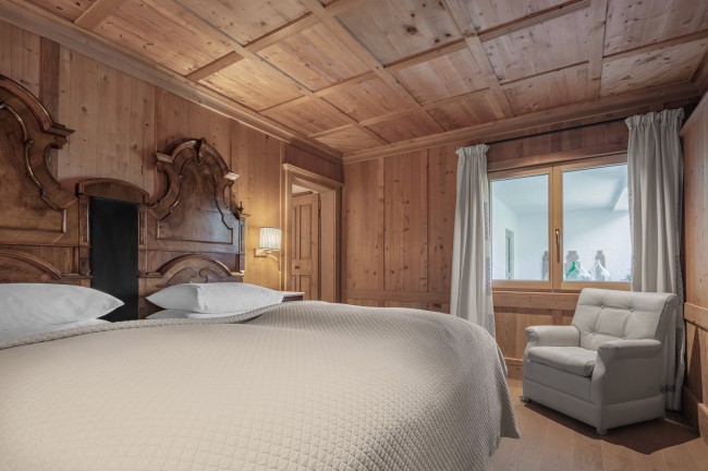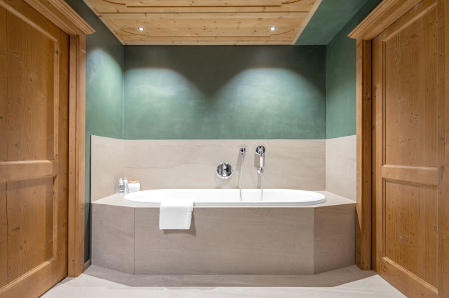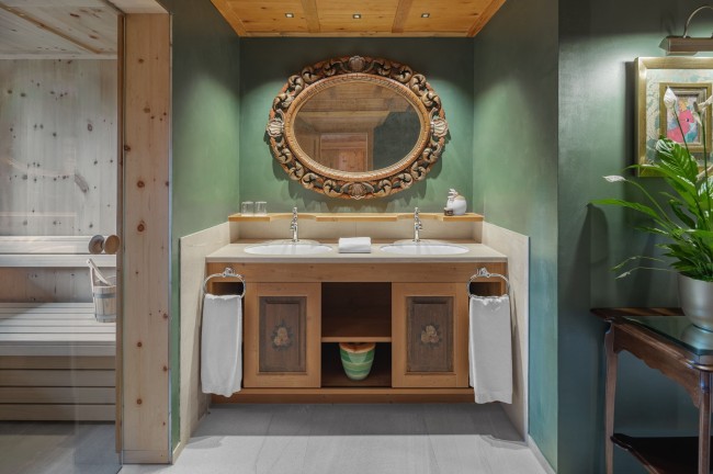 Alles hier ist doppelt vorhanden: Es gibt zwei voneinander getrennte Doppelschlafzimmer, zwei Badezimmer (das eine mit Wanne und Dusche, die auch als Dampfbad genutzt werden kann, das andere nur mit Dusche ) sowie ein separates WC und zwei Balkons mit atemberaubendem Dolomitenblick. Die Räumlichkeiten sind so angelegt, dass bis zu sechs Gäste Platz finden.
