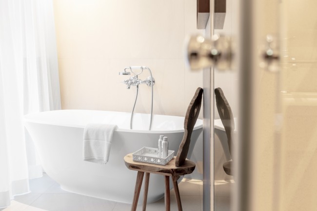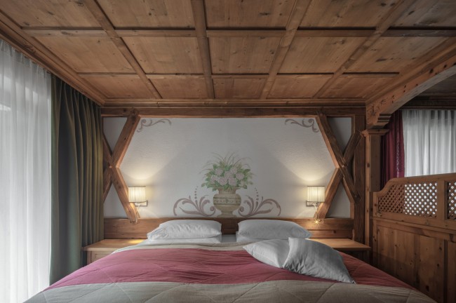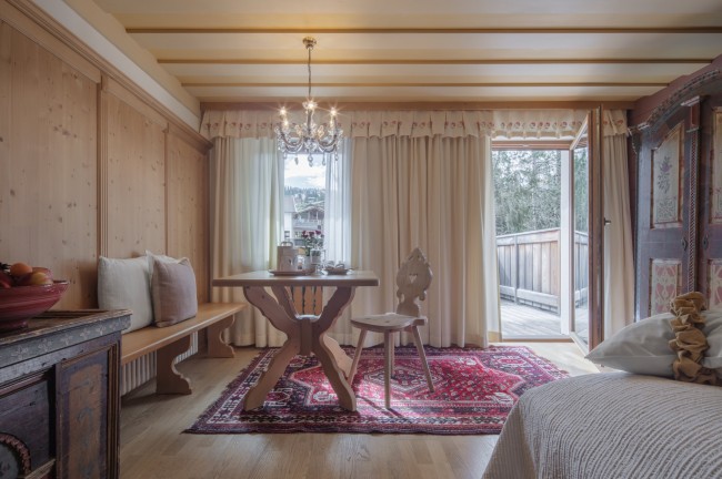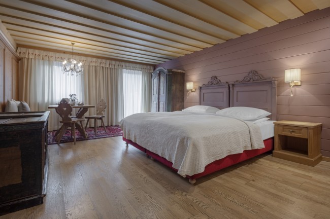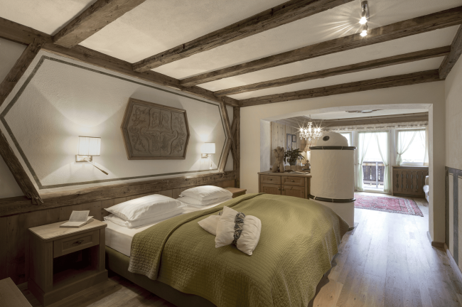 And the good thing is, everything comes in sets of twos: two, separate double rooms; two bathrooms – with a bathtub and shower – which transform into a Turkish bath with a separate WC; and two balconies with a breathtaking view over the Dolomites. The suite is ideal for up to six guests.